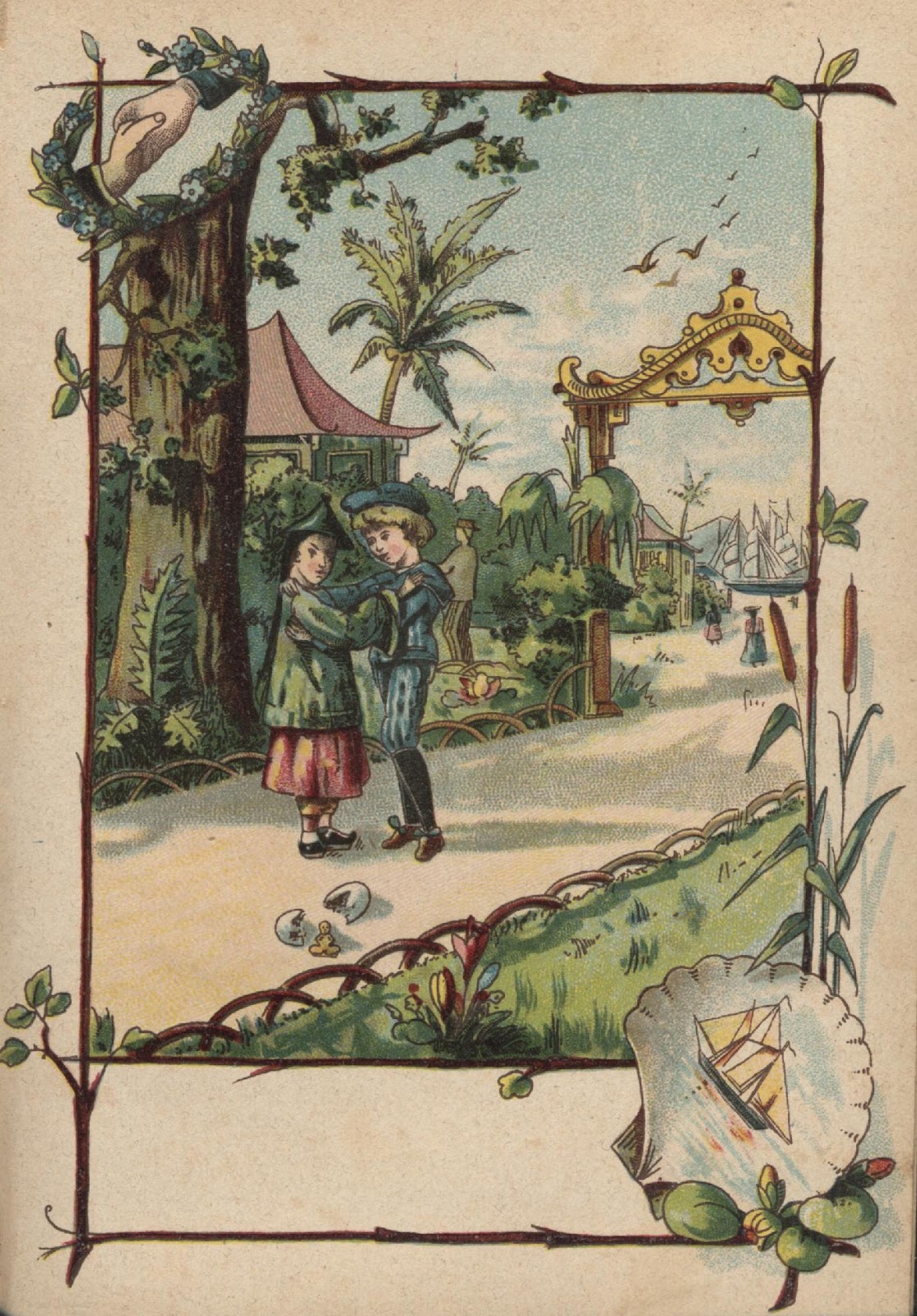 ‘Onbeschaamde Chinees!’ roept hij uit en slaat den kleinen kaalkop met het boek om de ooren.’ […] Huilend klaagde Hain aan Abeong zijn nood. Deze was natuurlijk buiten zich zelven, omdat Bob haar lieveling geslagen had, maar zij troost[t]e en liefkoosde hem, totdat de kleine weer gelukkig uit zijn scheeve oogen keek.’
